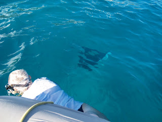 Ce matin, elle se faisait dorer la pilule sur le dos. Elle nageait à l'envers, montrant une belle tache blanche faisant ressortir l'éclat de turquoise à l'entour. Un ravissement spectacle. Ce qui rend ces rencontres précieuses, c'est qu'elles ne sont pas commandées. Elles surviennent inopinément. Elles sont le gage d'un émerveillement de quelques minutes ou d'une période qui dur plus longtemps. C'est la raie qui décide. Et nous ne pouvons qu'espérer la discerner. Et pourquoi pas? Peut-être un jour, nager avec elle? Si elle le consent...